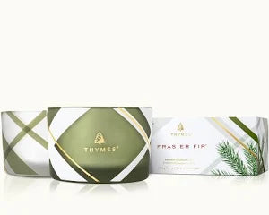 Thymes Frasier Frosted Plaid Candle Set: fill your home with the mountain fresh fragrance of Frasier Fir with this beautiful candle set of deep frosted greens and mercury gold plaid design. 2 x 3oz candles included. Mountain fresh and glowing, this scented holiday gift set enhances any décor or makes an elegant hostess gift. Fills your home with crisp, just-cut forest fragrance that evokes seasonal celebrations, holidays and the winter solstice.