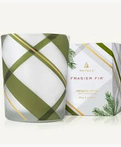 Mercury gold, deep frosted greens, and the mountain fresh fragrance of Frasier Fir make this petite-sized candle the ideal gift of the season.