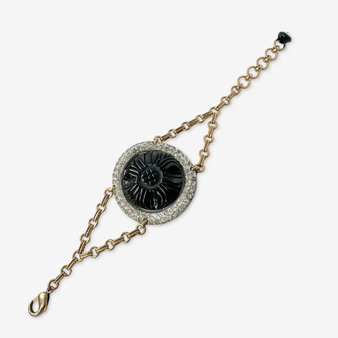 * Vintage round carved black bakelite flower in clear rhinestone and silver tone setting Raw brass chain with lobster claw clasp, finished with vintage black glass button * Adjustable to fit up to a 7" wrist * 1-5/8" diameter * one of a kind *all rhinestones intact, but may display slight discoloration consistent with age