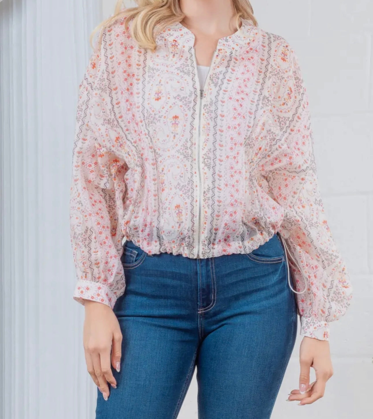 CC SHEER BOMBER JACKET WITH RUCHING DETAIL