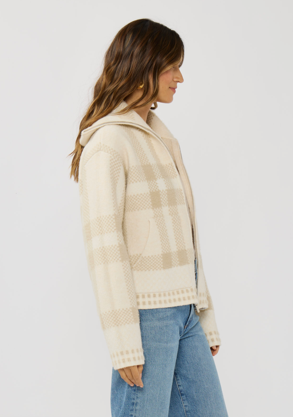Bold yet cozy, this plaid knitted bomber jacket is the perfect fall layering piece. It features a wide spread collar neckline that adds structure and warmth, along with a front zip closure, functional pockets, and mirrored plaid placement at the center front and sleeves. Finished with 2 inch ribbed cuffs and hem for a snug fit, this cropped silhouette puts a modern twist on a timeless classic.