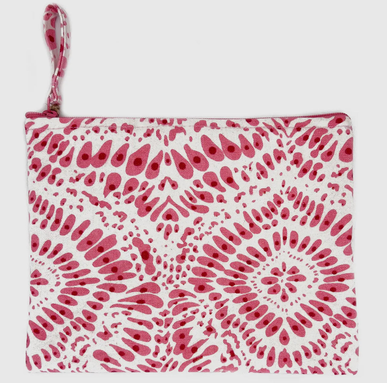 100% cotton, hand block-printed zipper pouches. Crafted with durable canvas with a sturdy zipper.