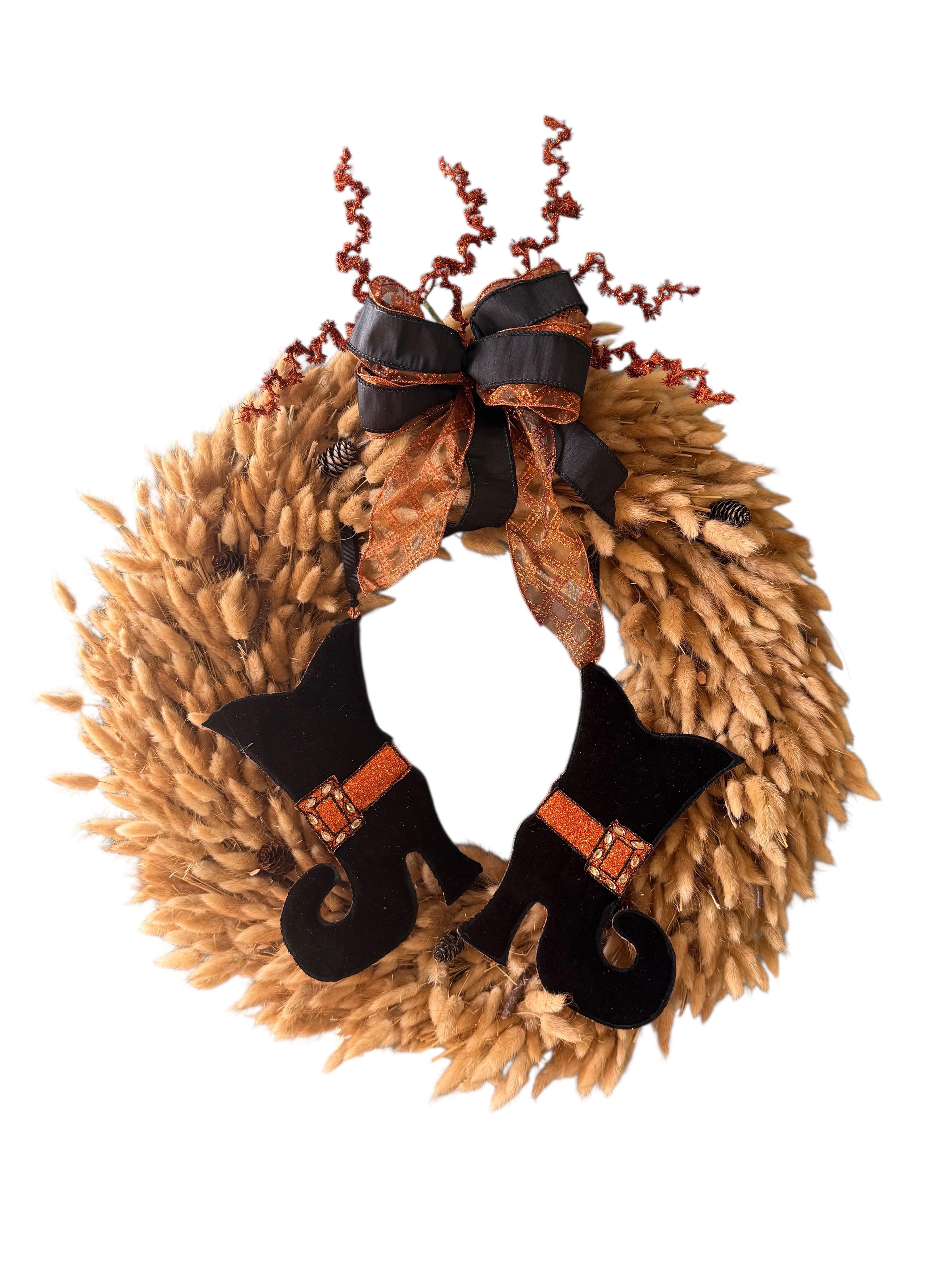 Hints of nature create a significant impact in any space as well! The Bunny Tail Wreath with pine cones does just that, whether used year-round or Holiday décor. This is also adorned with a Halloween sparkle bow and witches boots. With delightful materials, this carefully crafted piece oozes organic warmth for indoor or outdoor styling. I love to see it framed by a door, above a mantel, or in a window.