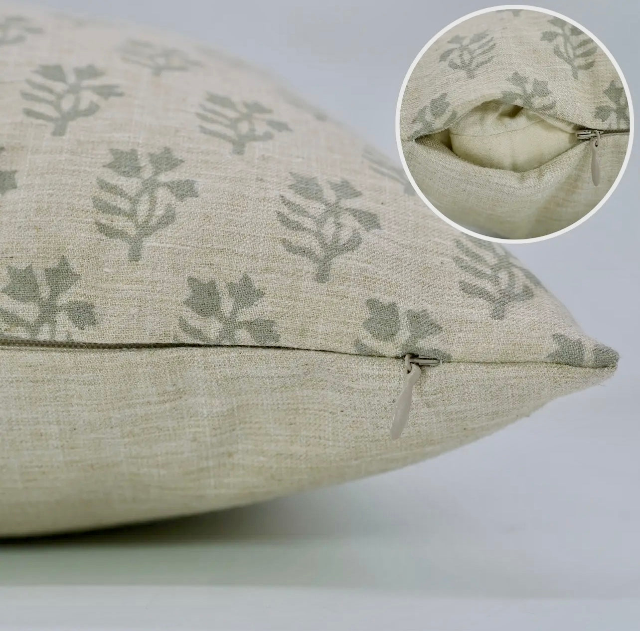 20"x20". Linen blend. Hidden zipper closure. Hand wash/line dry or Dry Clean.