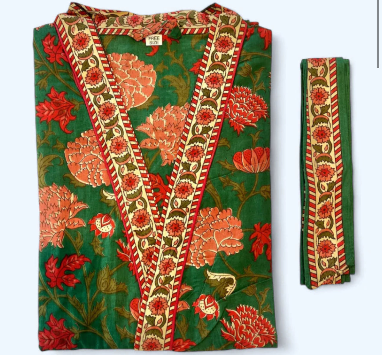 Each robe is crafted by hand in soft, breathable cotton, making it as comfortable as it is beautiful. Perfect for leisurely mornings, evenings at home, or simply wrapping yourself in a touch of artful elegance.