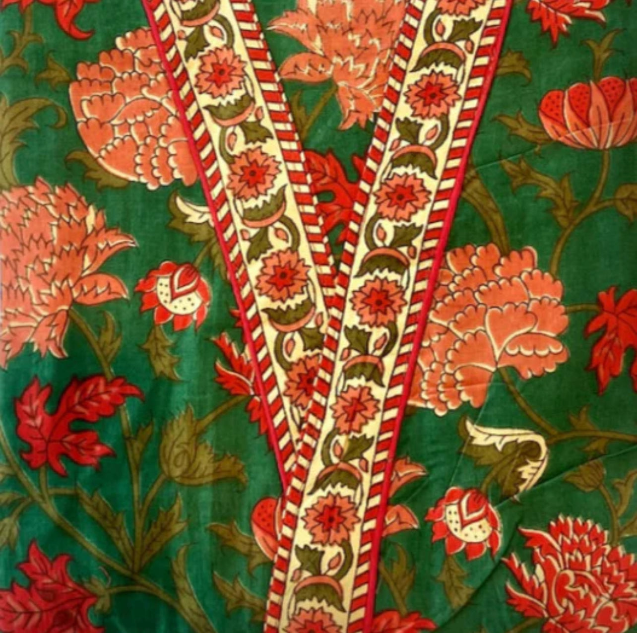 Our Bloomsbury Green Petal robe is block printed in a stylized floral design inspired by the free-spirited artistry of the Bloomsbury Group evoking the creative energy of that era.