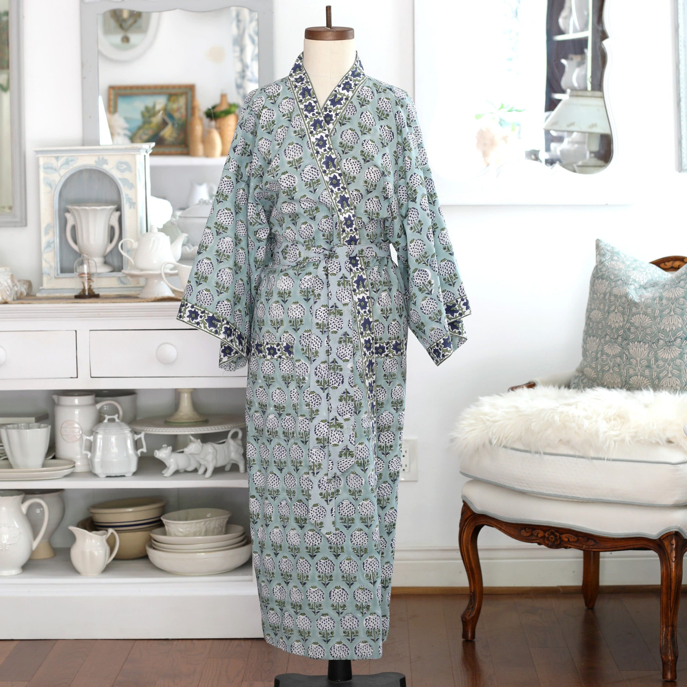 Constructed from a soft cotton voile, our 48" long robe has two front pockets and ties with a belt. Contrasting trim along facing, pockets and sleeves add a couture detail. Presented in a matching fabric envelope ideal for use in your travels or gift giving.