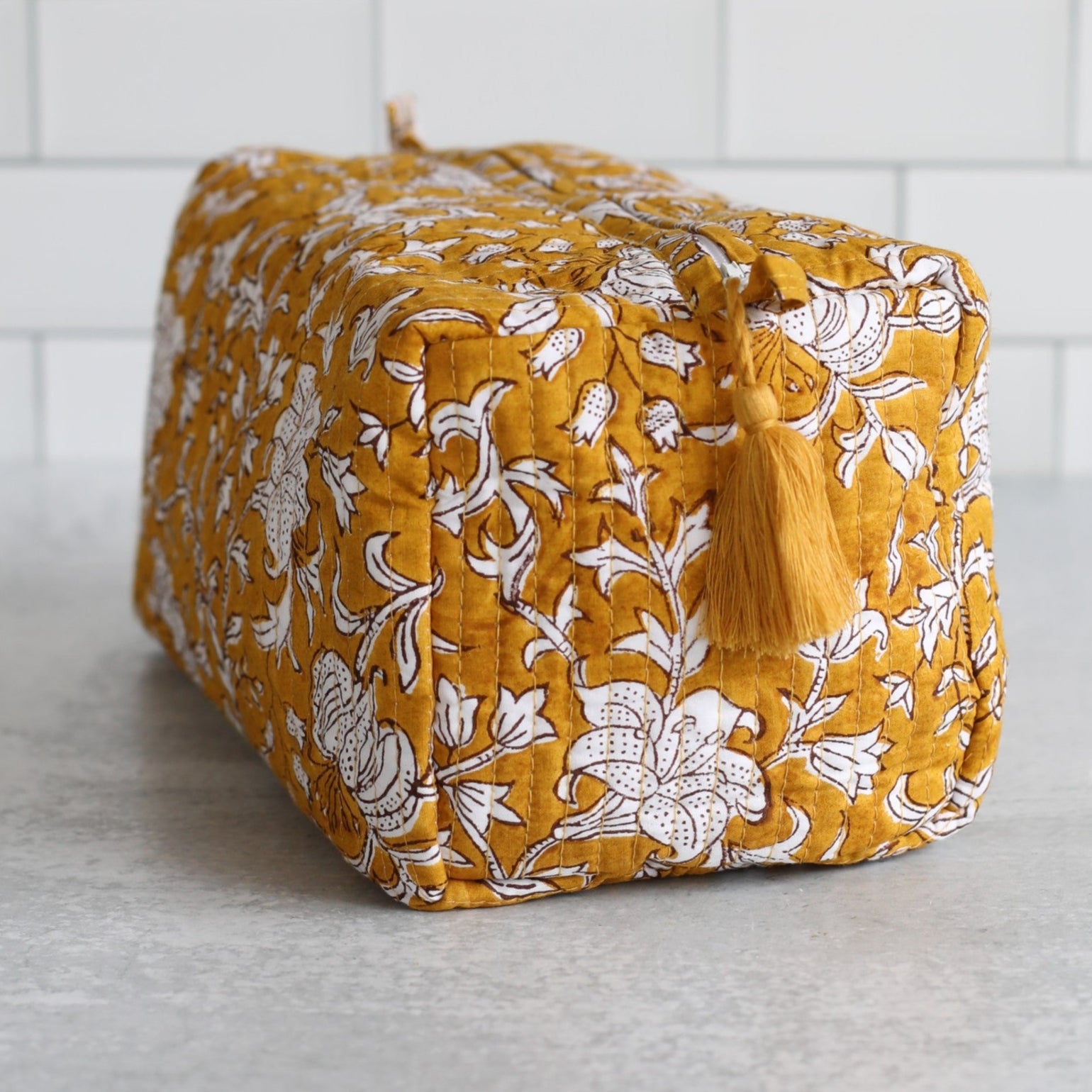 The cosmetic bags are constructed from a quilted block-printed cotton. The inside is lined with plastic for easy clean-up, with two handy pockets on one side. A pretty tassel is attached to the zipper.