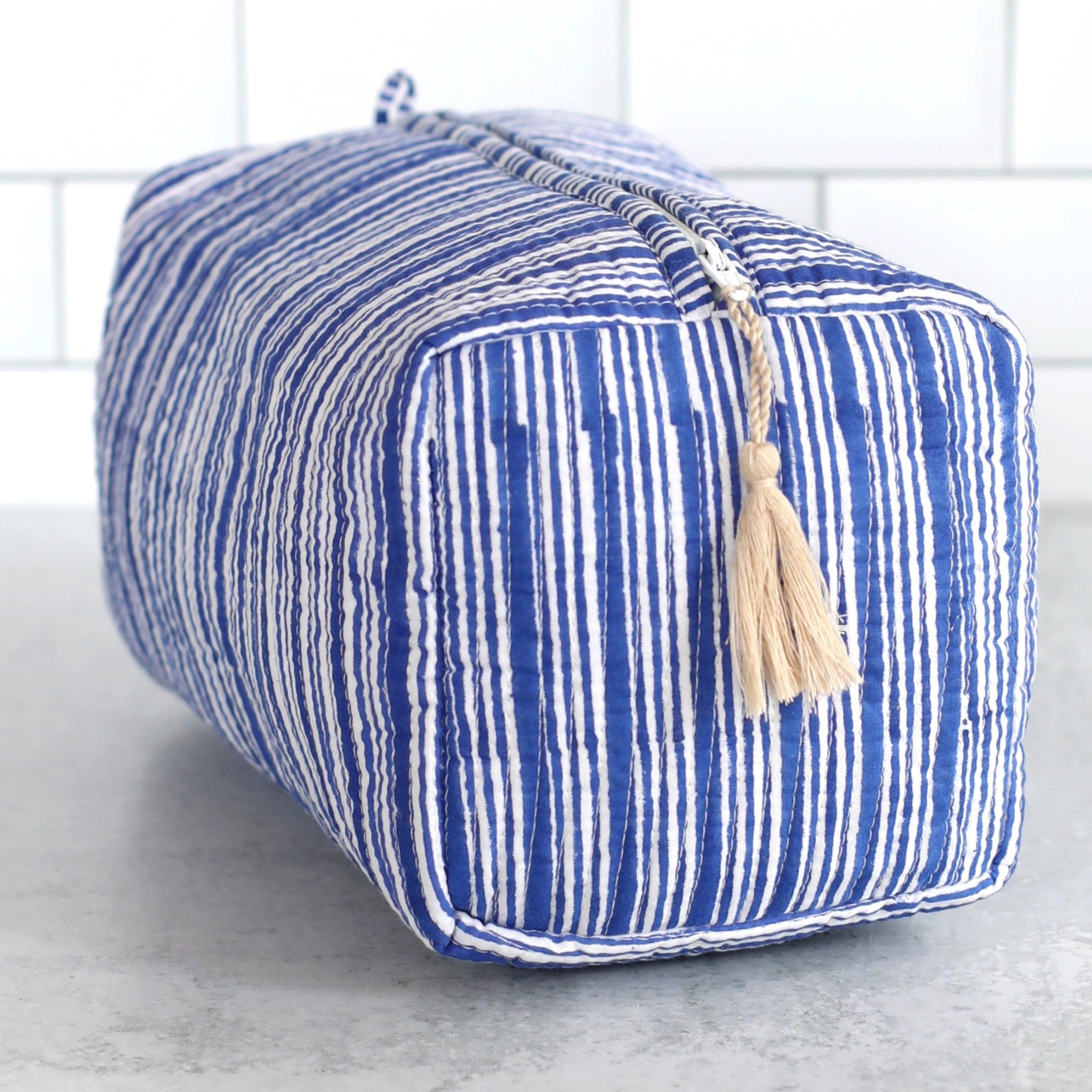 The cosmetic bags are constructed from a quilted block-printed cotton. The inside is lined with plastic for easy clean-up, with two handy pockets on one side. A pretty tassel is attached to the zipper.