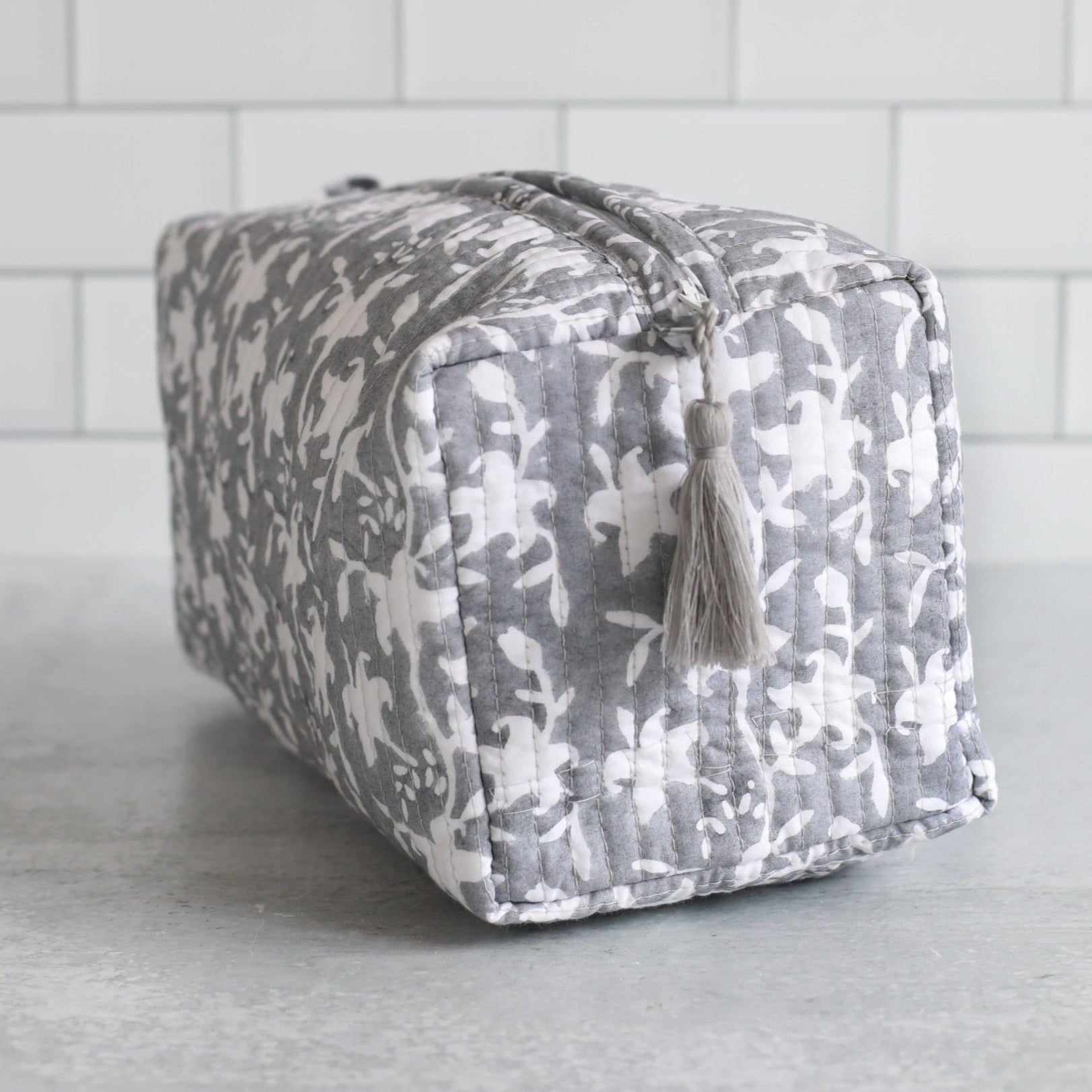 The cosmetic bags are constructed from a quilted block-printed cotton. The inside is lined with plastic for easy clean-up, with two handy pockets on one side. A pretty tassel is attached to the zipper.