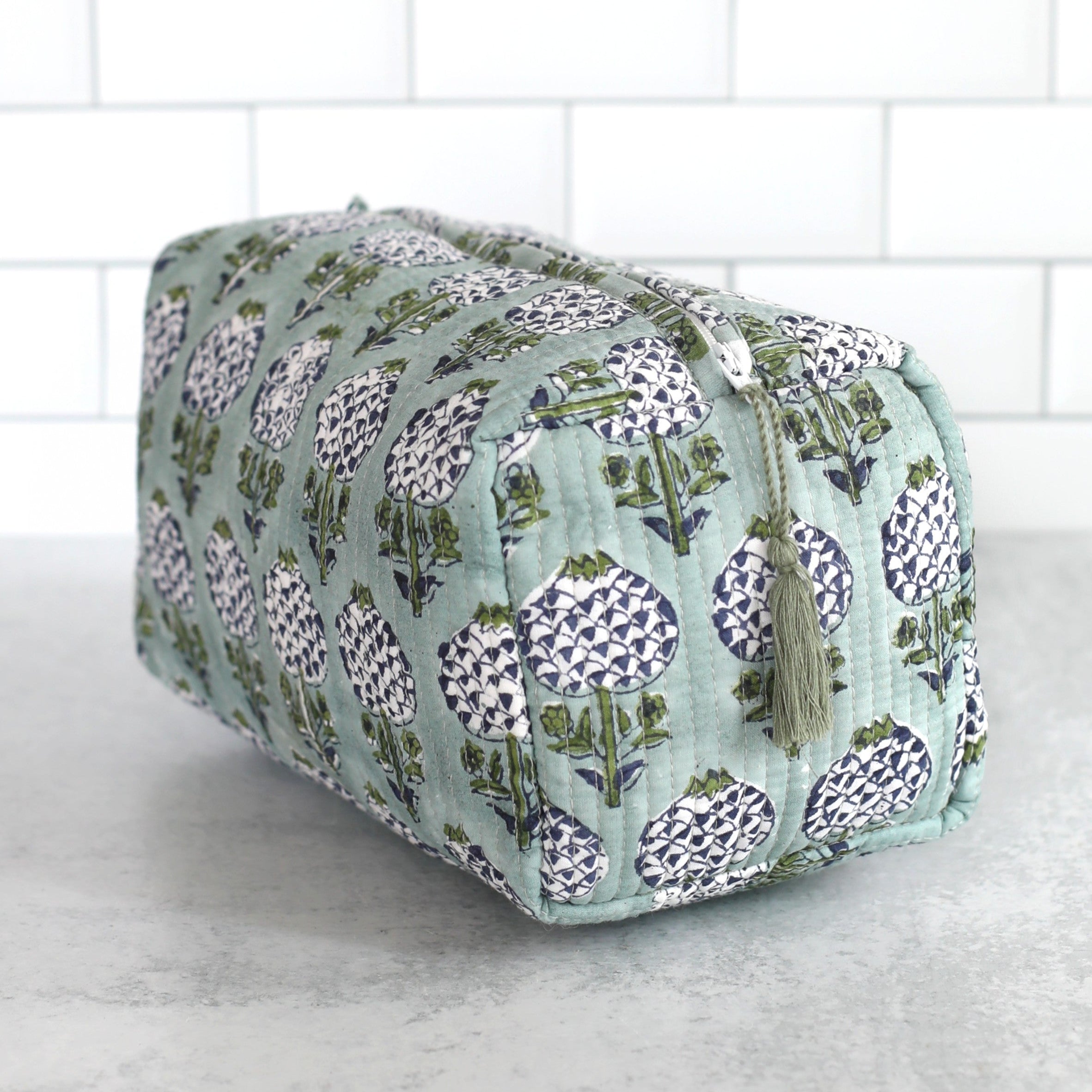The cosmetic bags are constructed from a quilted block-printed cotton. The inside is lined with plastic for easy clean-up, with two handy pockets on one side. A pretty tassel is attached to the zipper.