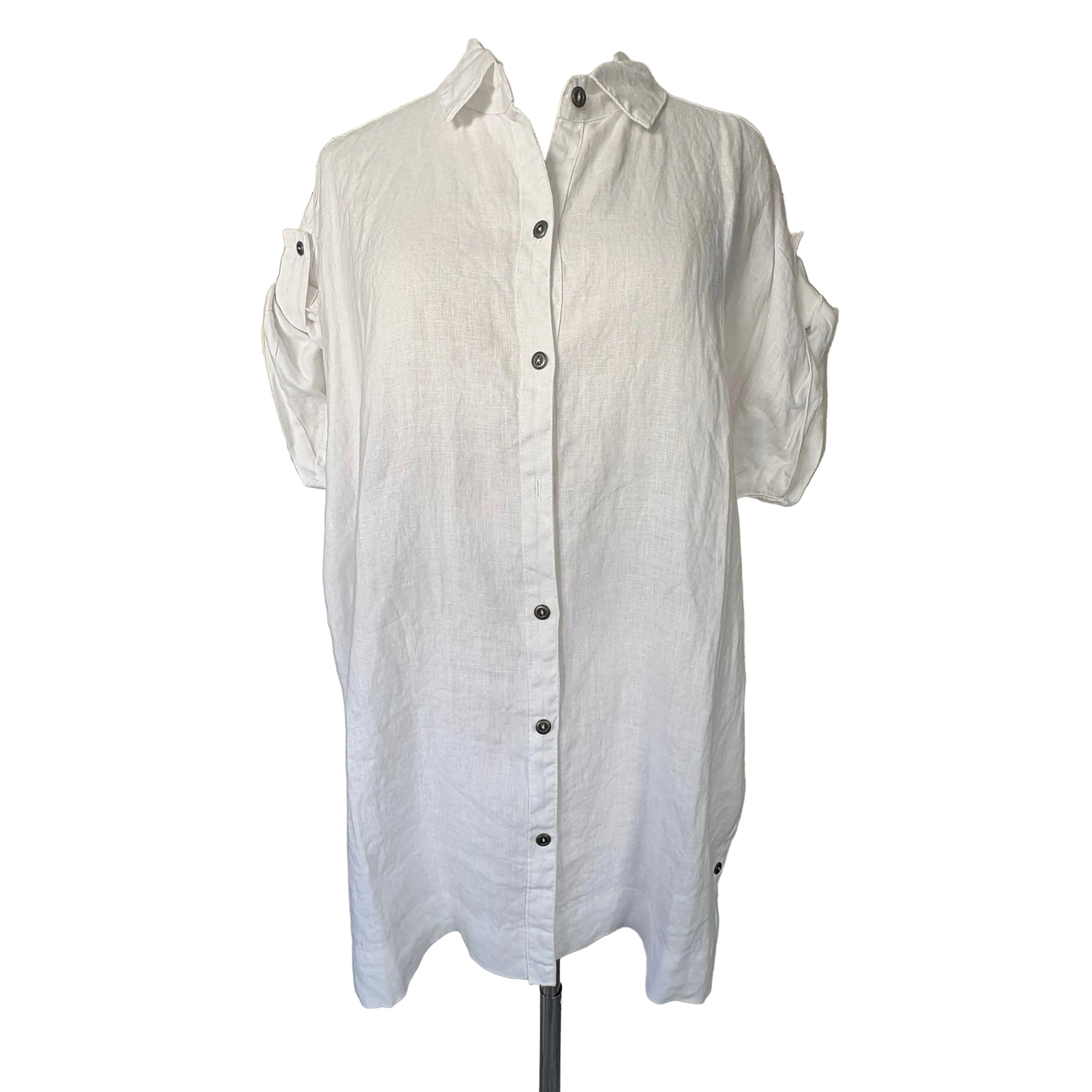 M Rena White Linen Long Button up collaredTop with Sleeve tabs