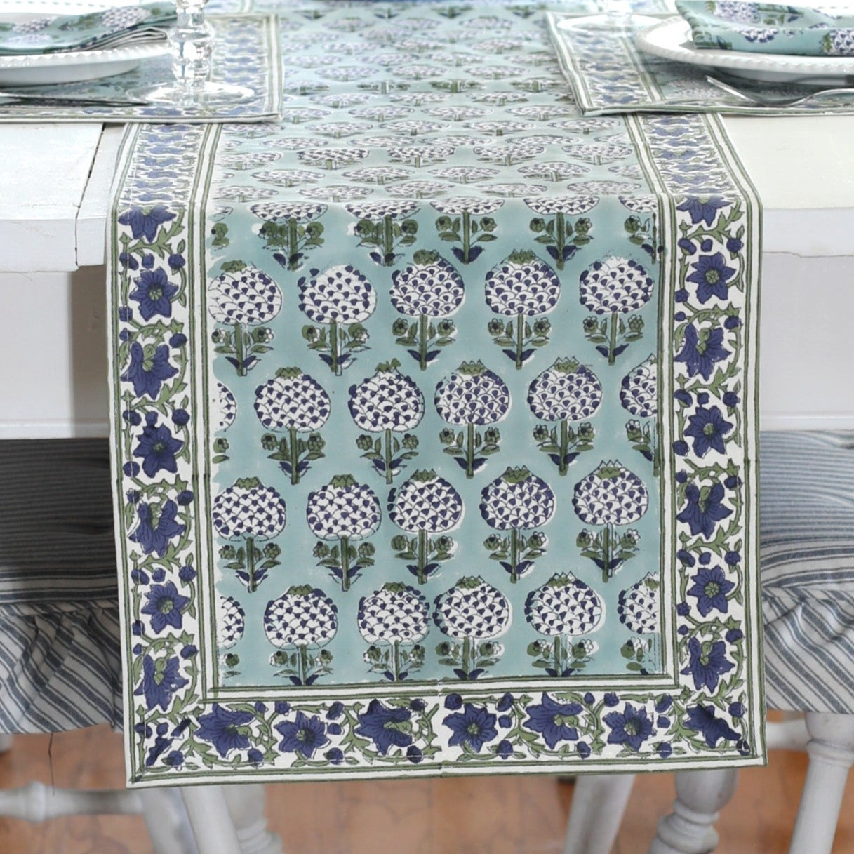 Hand block-printed in Jaipur, India on 100% cotton canvas. Machine wash & hang dry 14″x90″.