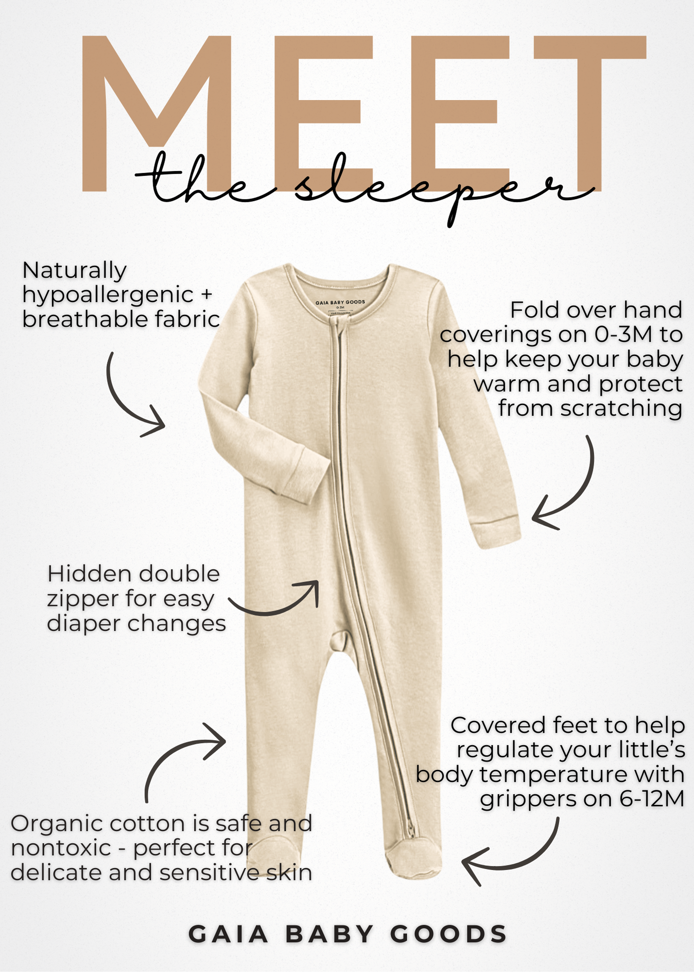 Meet your favorite footed sleeper to lounge, snuggle, and snooze in. Featuring cozy long sleeves and covered feet, these organic cotton pjs are buttery soft, breathable, and naturally hypoallergenic. These sleepers are made with our new organic cotton fabric for an even softer feel, and designed in accordance to all federal children's sleepwear regulations. DETAILS - Double zipper for easy changes - Grippers on the bottom of 6-12M size to help support your little one's motor skill development - Fold over mitts on 0-3M to assist in newborn's temperature regulation and protect from scratching - No snaps, buttons, or interior tags - GOTS certified organic cotton - OEKO-Tex certified nontoxic and free of harmful chemicals - Packaged with sustainable, eco friendly materials and zero plastic