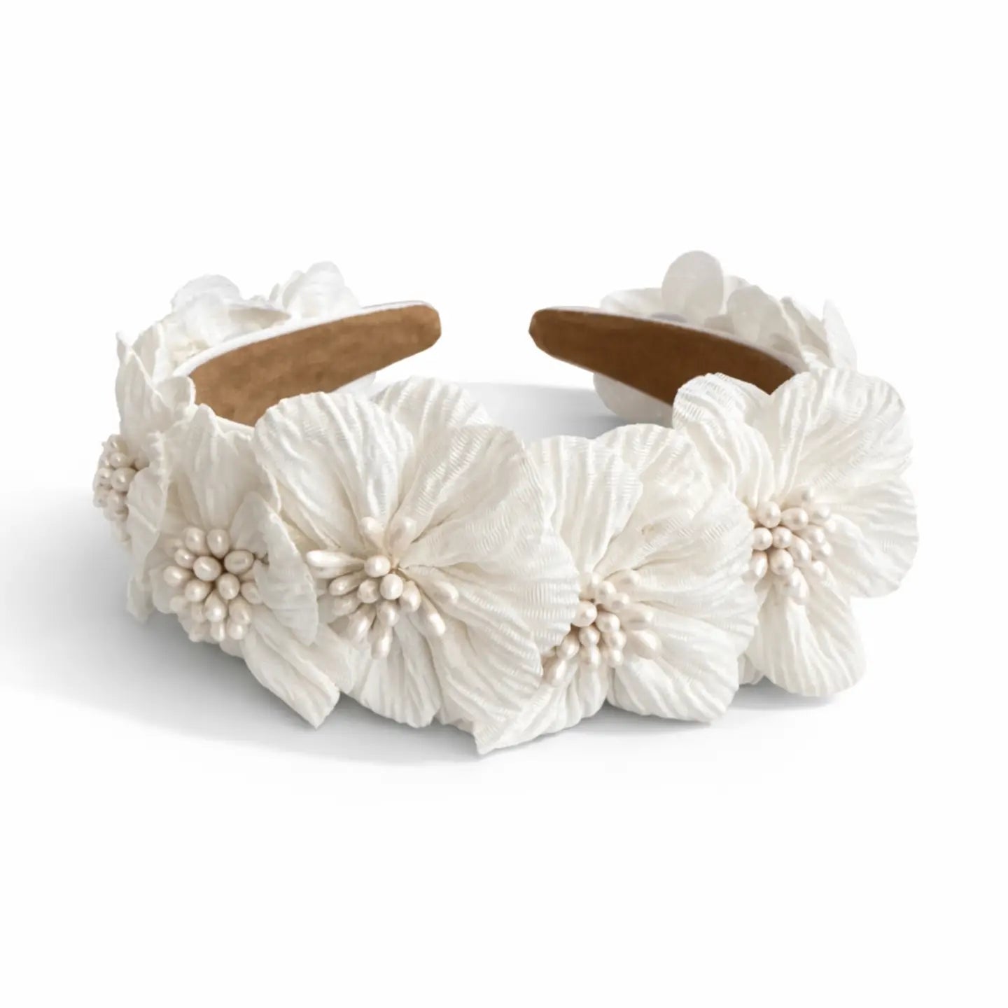 This beautifully crafted piece features layered white floral appliqués adorned with delicate pearl accents, creating a soft, ethereal look