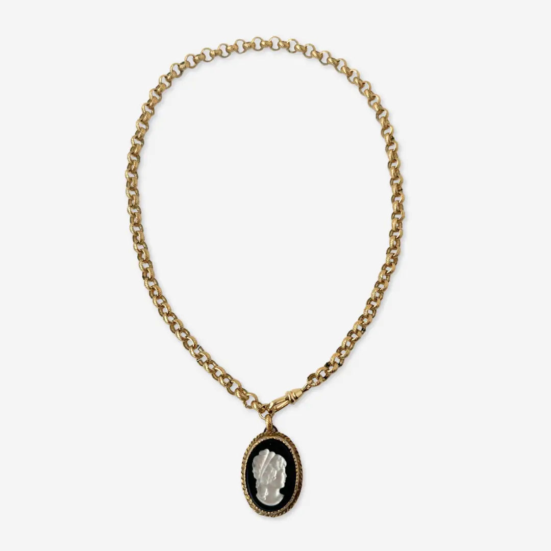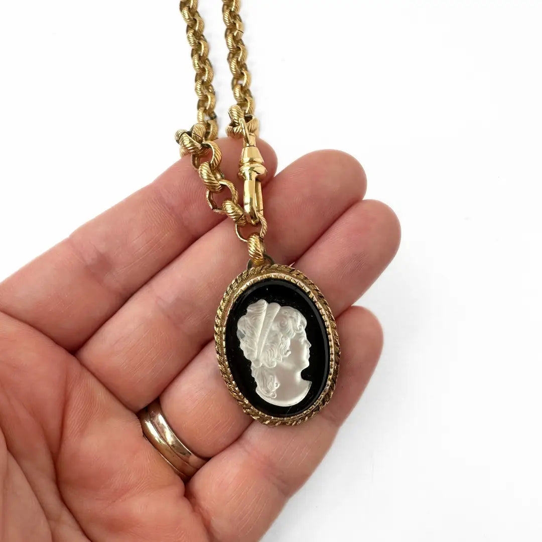 Vintage oval cameo, containing a white moon glass cameo on a black glass base, with gold tone frame