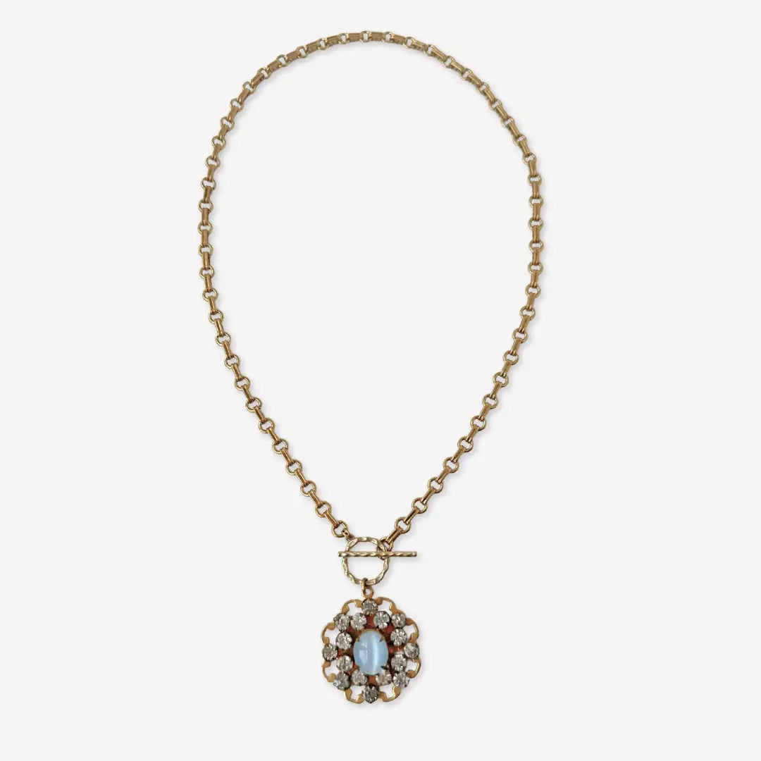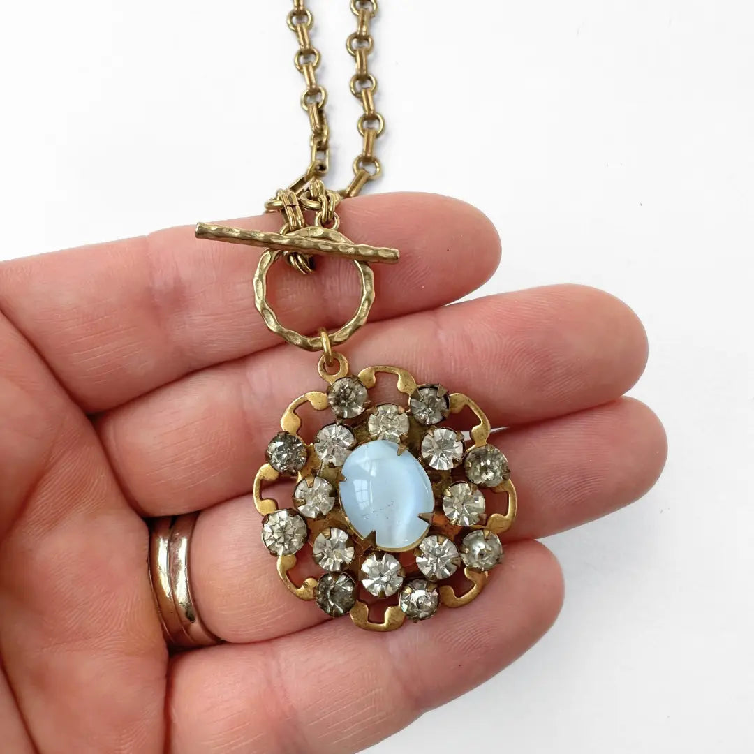 Vintage pendant, containing a pale blue oval moonstone and clear glass rhinestones in a brass prong setting * Raw brass industrial rolo chain, 18" long * front toggle closure