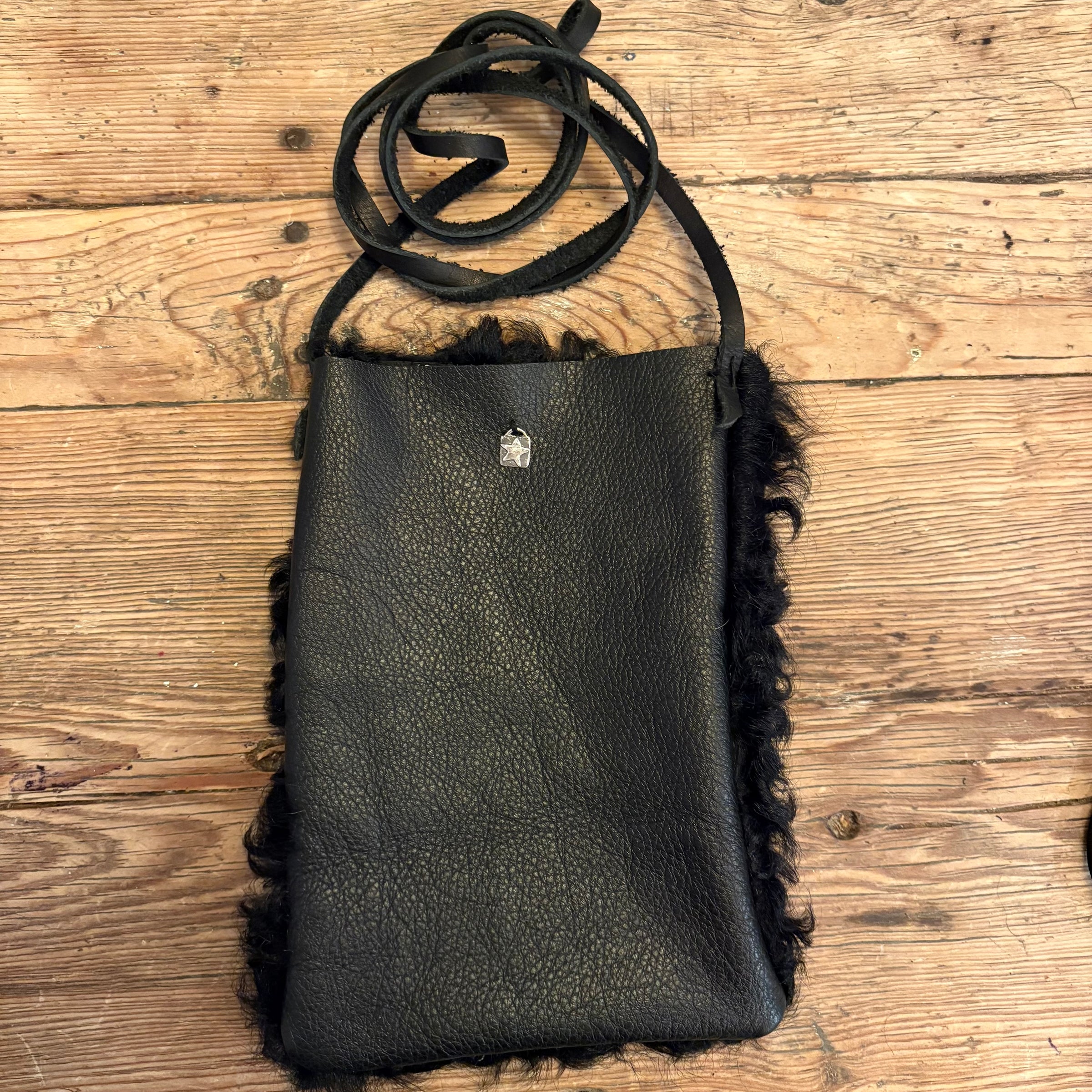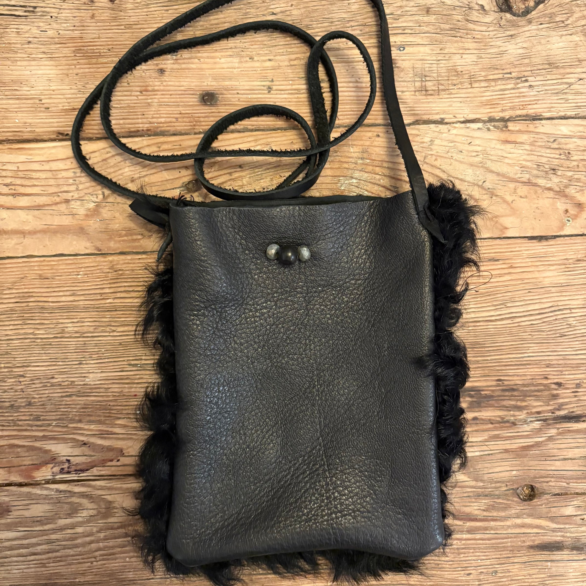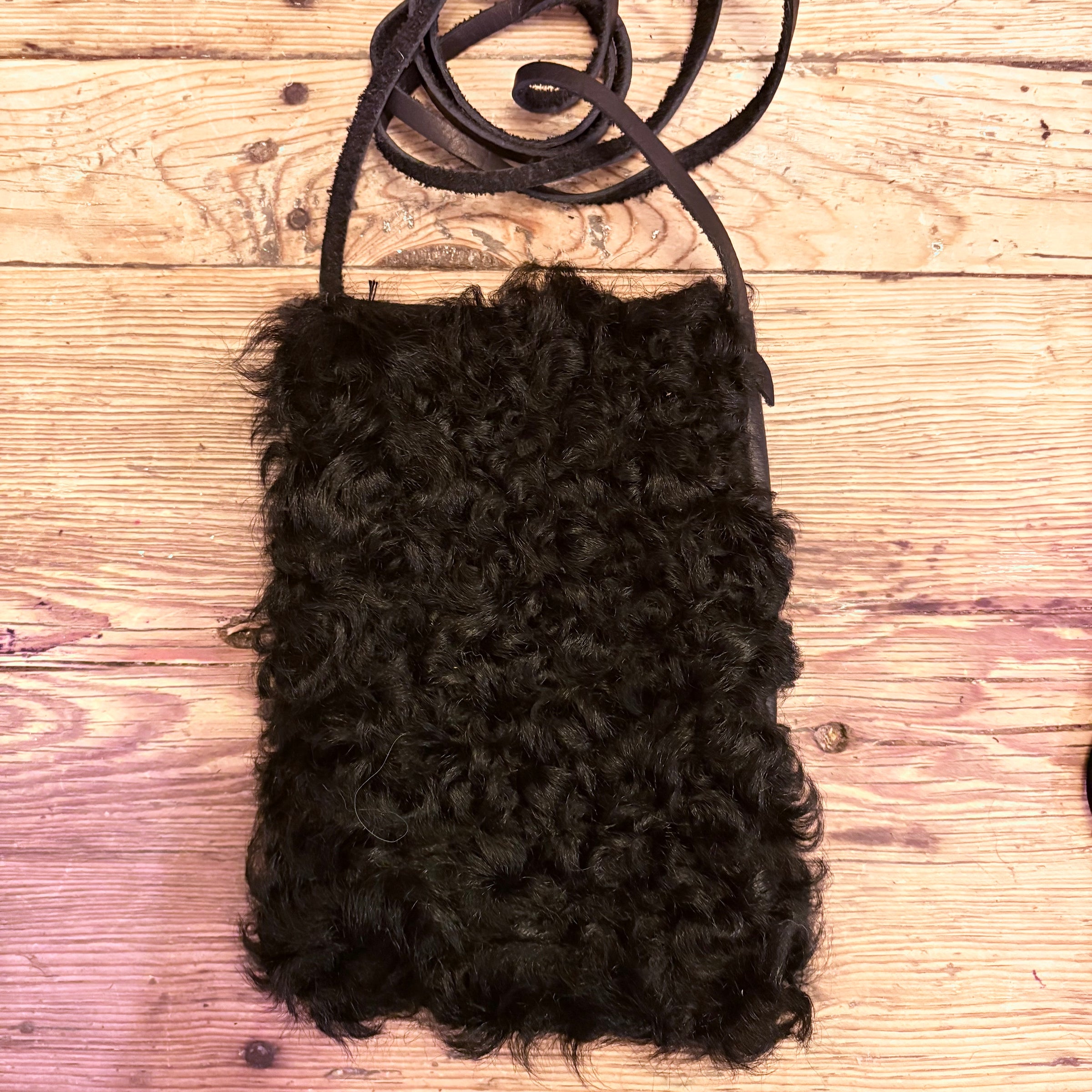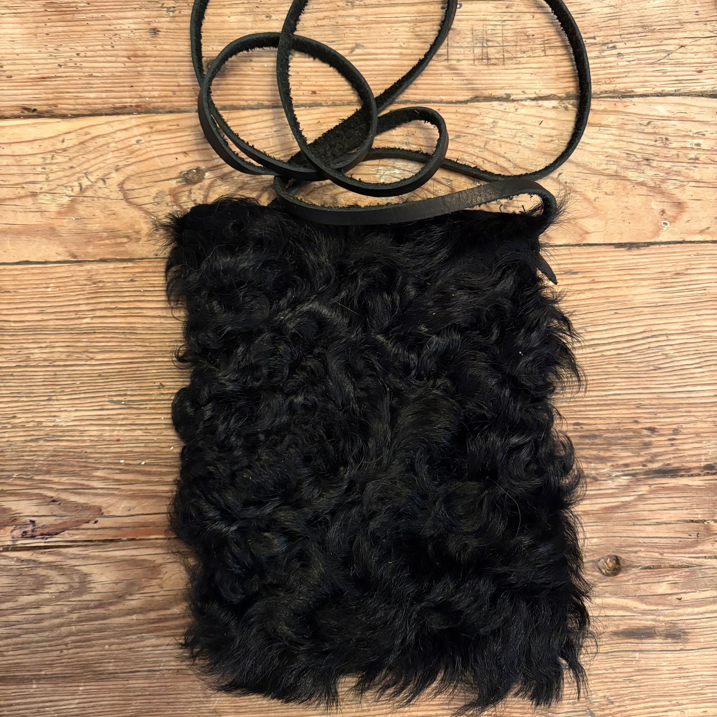Style:  Black Curly Fur / Black leather  with long cross body strap. Bead Accent.