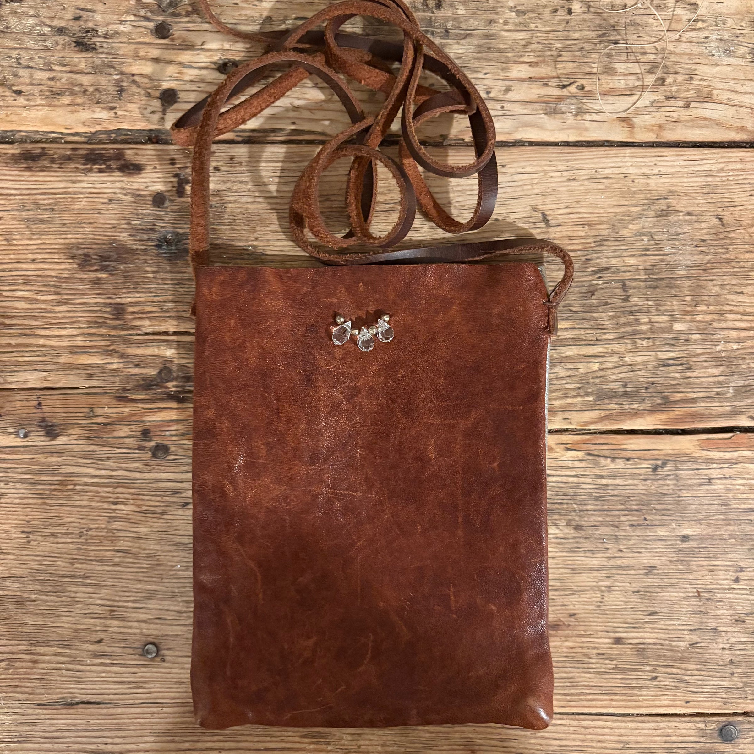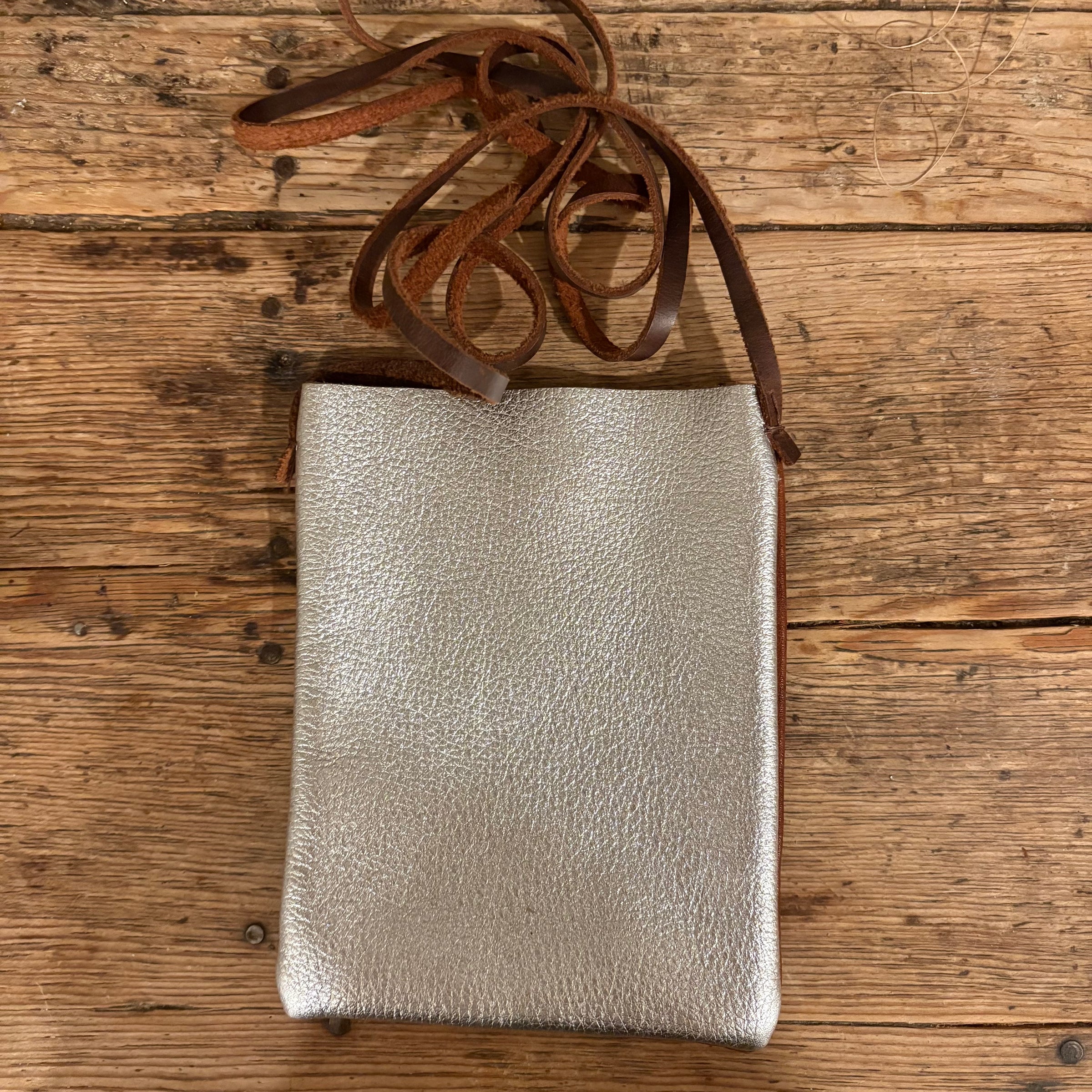 Style: Cordovan Leather / Silver leather with long cross body strap.