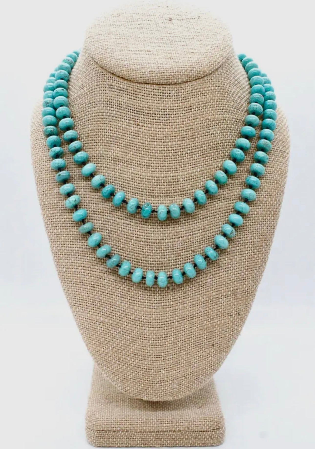This 30" long, hand-knotted turquoise necklaces features beautiful African turquoise or turquoise . The intricate craftsmanship adds a touch of elegance to your wardrobe, and the vibrant colors bring out your natural beauty. Experience a sense of peace and well-being with this stunning, one-of-a-kind necklace.