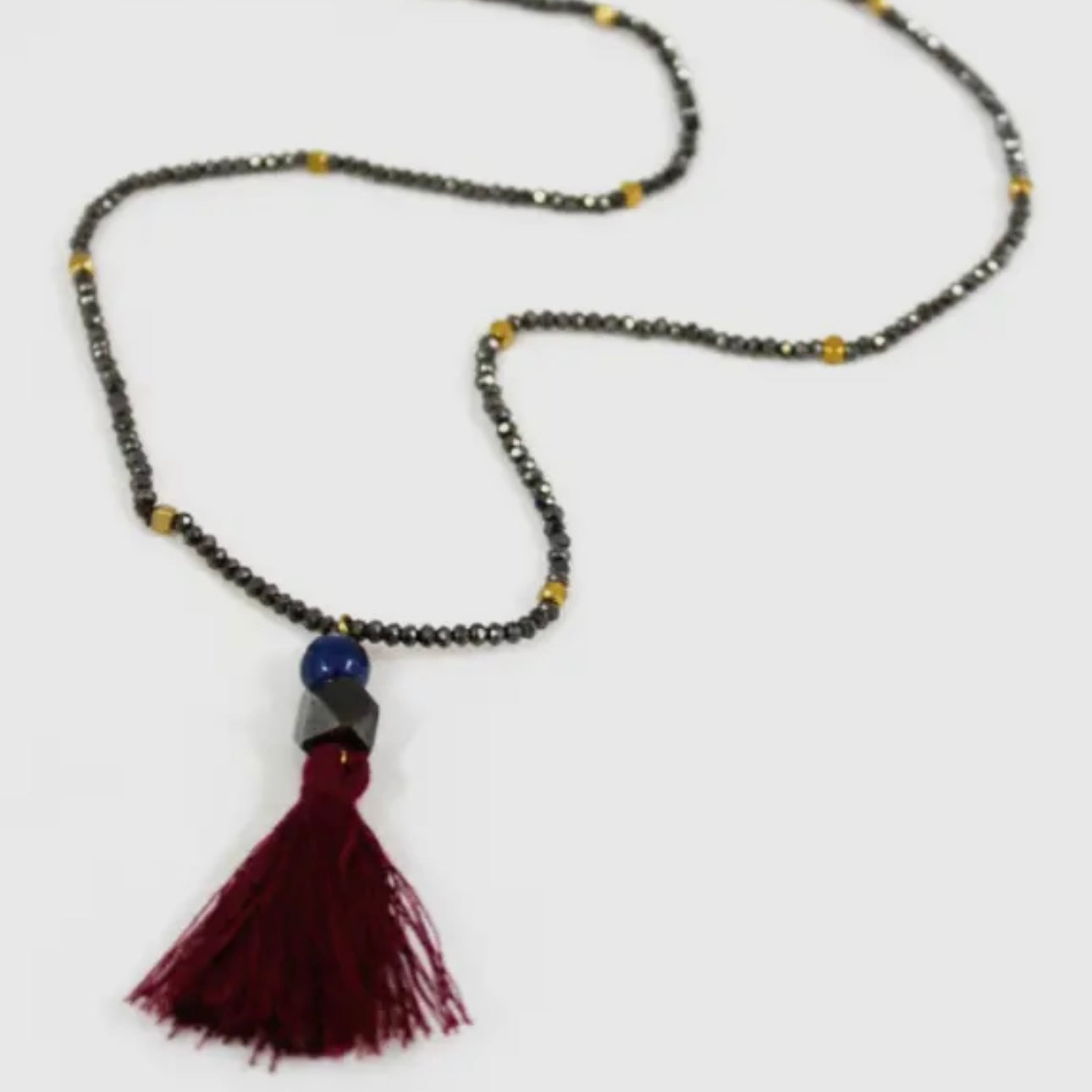 Elevate your style with this TASSEL ON CRYSTAL NECKLACE. Made in CA and designed in France, this necklace features a stunning crystal stones and tassel, adding a touch of elegance to any outfit. With a length of approximately 32 inches, it's the perfect addition to your jewelry collection.