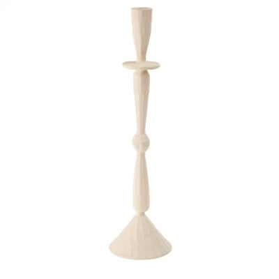 Elevate your table scape with the hand forged aluminum Imani Candle Holder, handmade in Moradabad, a city in India celebrated for its metal craftsmanship. The creamy neutral powder coating seamlessly combines contemporary flair with traditional manufacturing techniques, resulting in a stunning matte finish that exudes dramatic character. Add a sense of romance and occasion to everyday evenings by lighting candles at dinnertime, or by curating a vignette with a mix of sizes on a side console.
