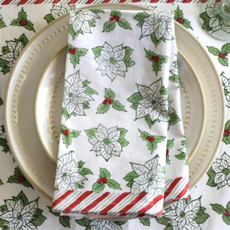 Expertly block printed by our artisans in Jaipur, India with soft green poinsettia flowers accented with hints of red, this festive design brings a joyful, yet elegant touch to your table setting. The candy cane border creates the perfect holiday ambiance without overwhelming your decor.