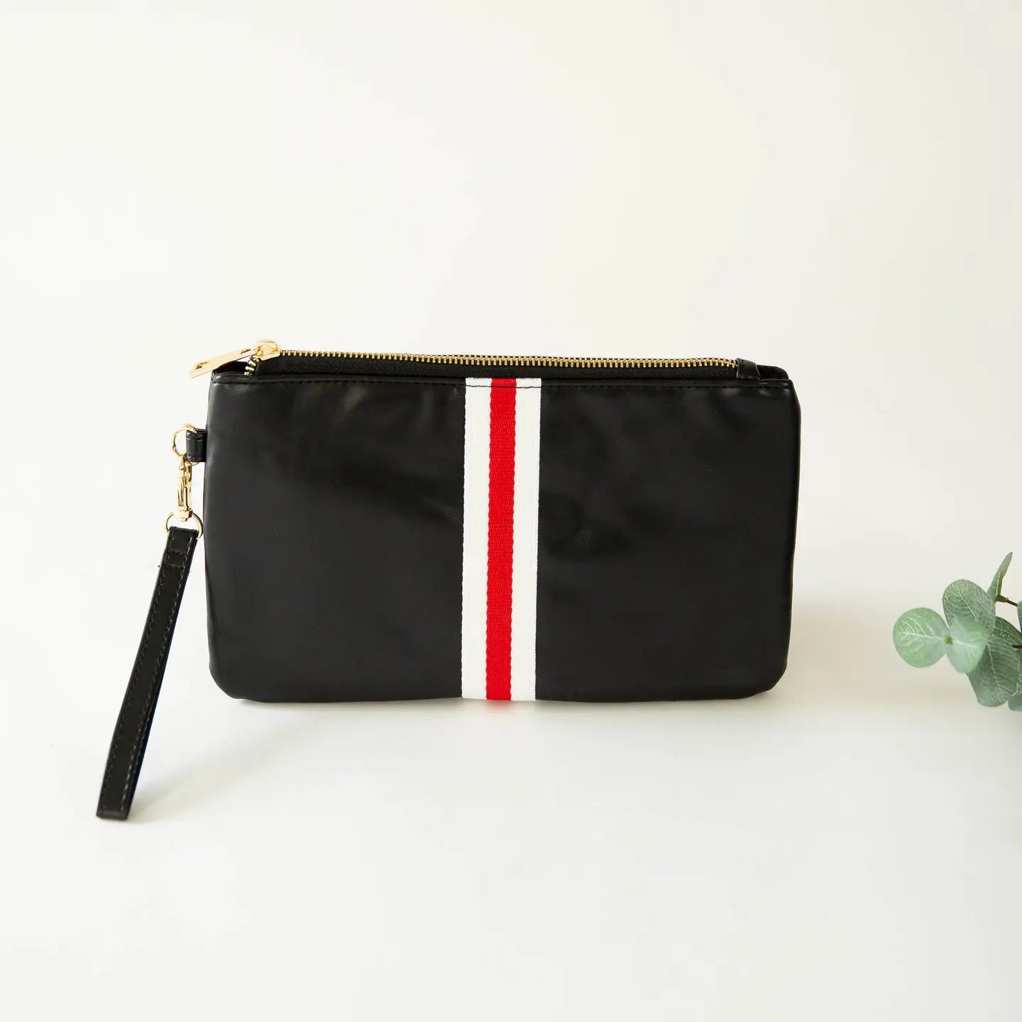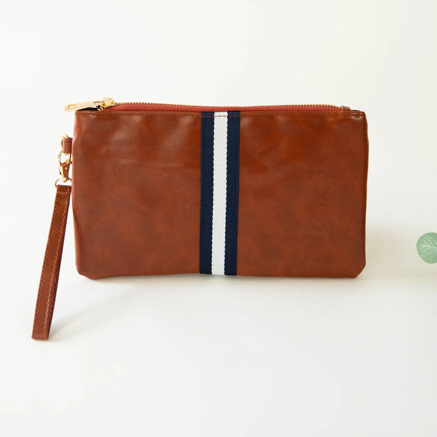 This adorable faux leather preppy clutch will be a simple addition to your wardrobe. A cute little preppy canvas ribbon runs through it - just to give a fun little detail.