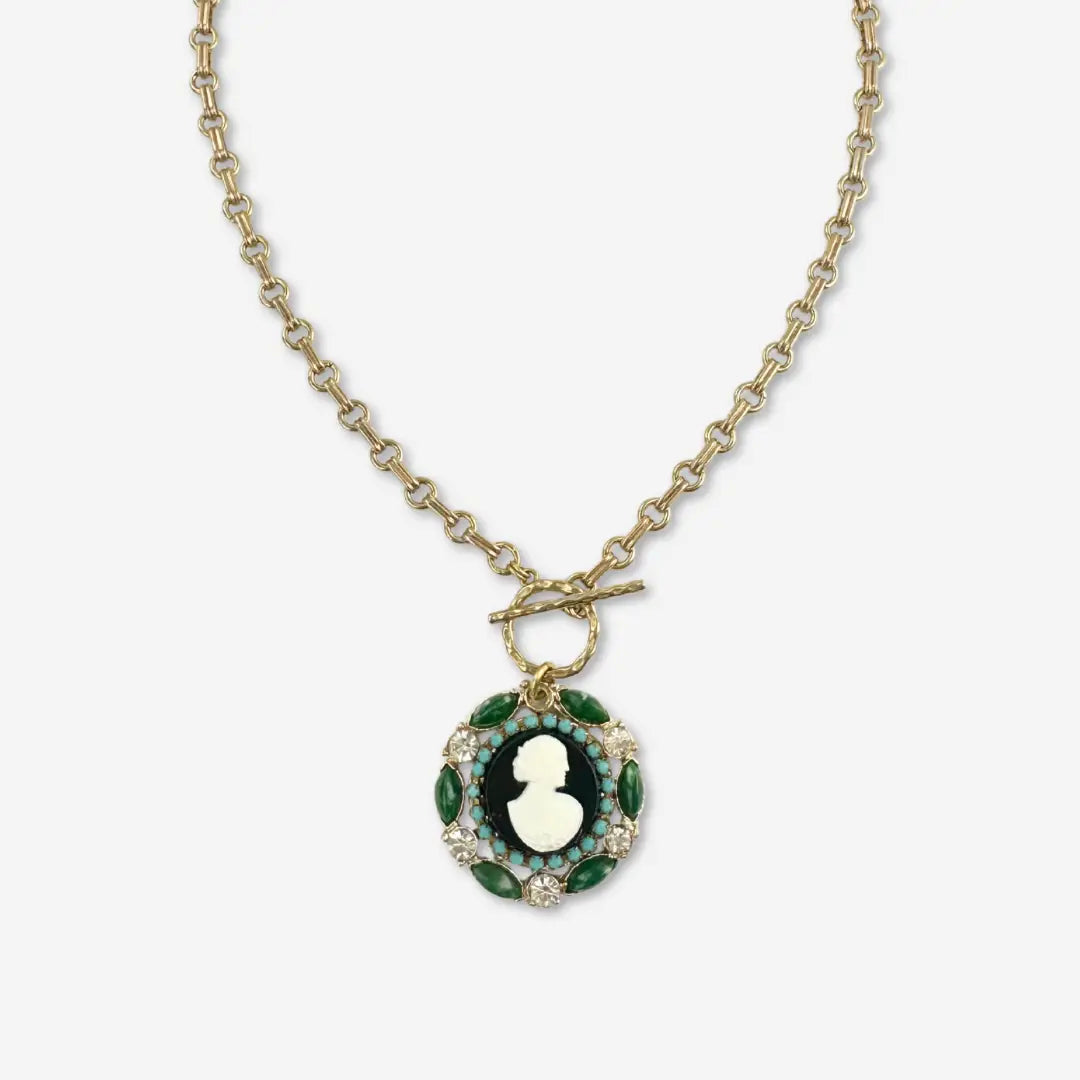 Refashioned vintage black, green, and turquoise cameo pendant necklace