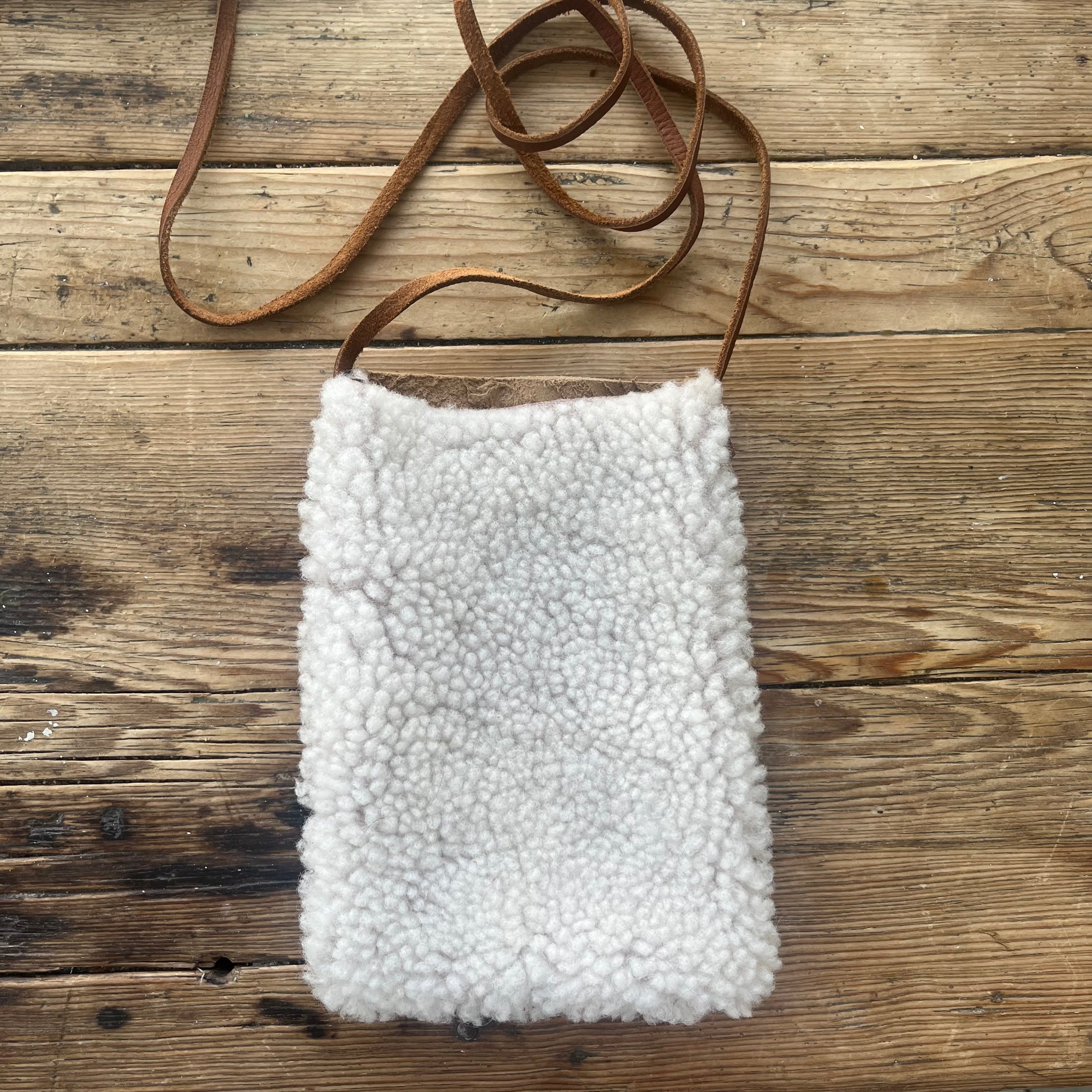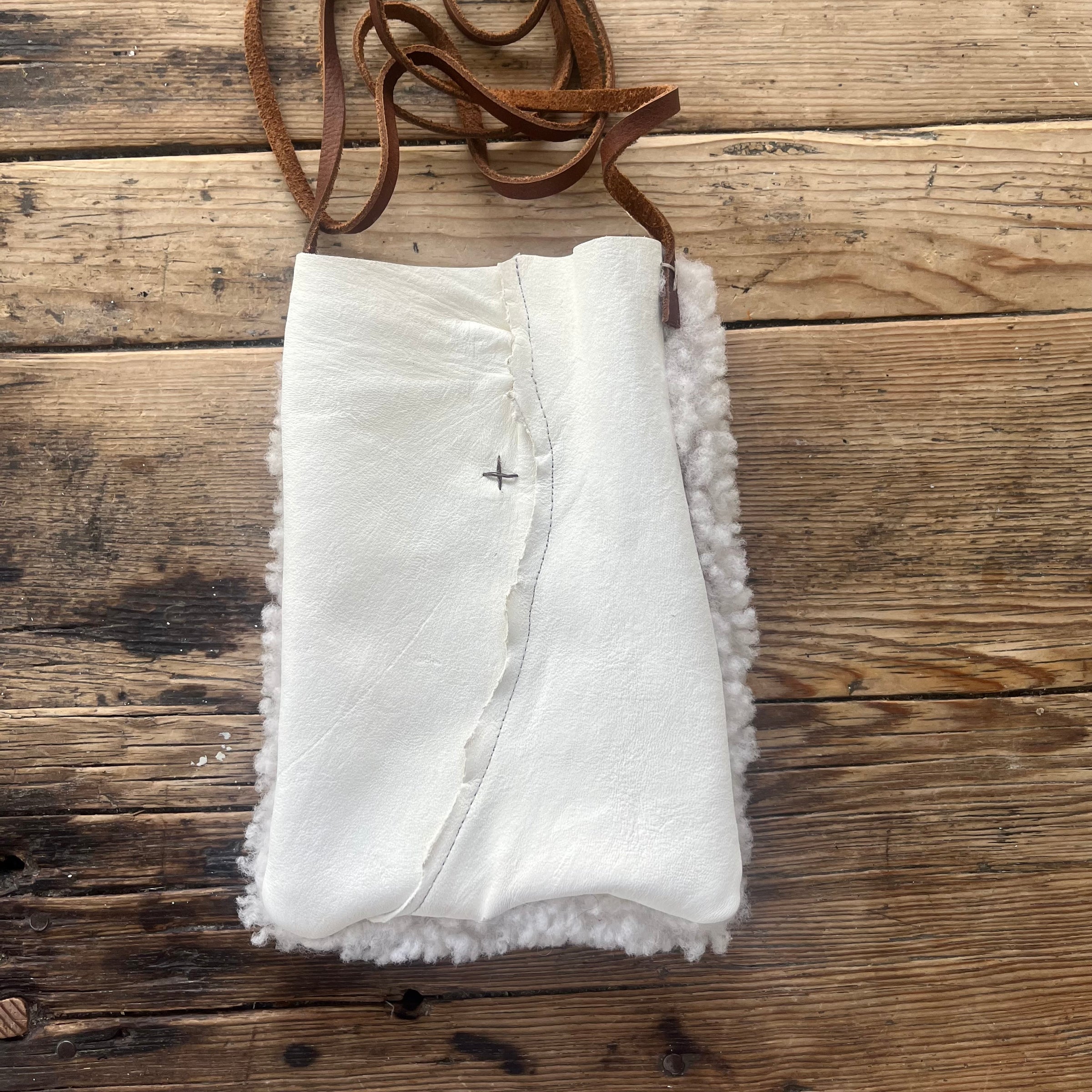 Style: Sherpa and leather with long cross body strap. Vintage White / Ivory